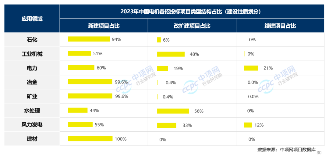 据中项网招投标数据显示,2023年,中国电机行业下游需求领域中,多数应用领域招投标项目主要是新建项目,其中石化、冶金、矿业、建材90%以上项目为新建项目,工业机械、水处理、风电改扩建项目占比较多,电力、风电行业续建项目占比相对高于其他领域。