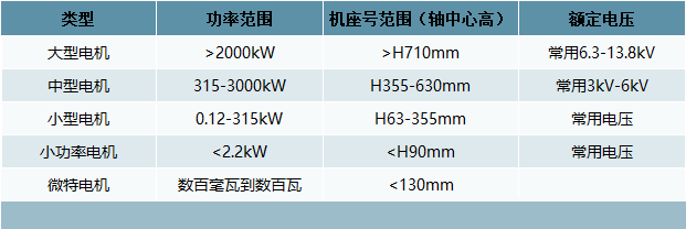按照功率的大小或机座号(又称轴中心高)或电压等级进行分类,一般分为大型电机、中型电机、小型电机、小功率电机(又称为分马力电机)和微特电机。