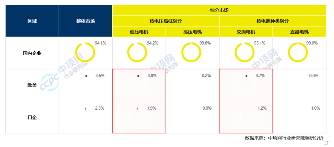 (1)国内企业占据9成以上市场,国外企业在低压电机、交流电机更具竞争优势。