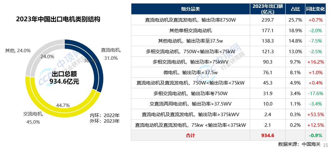 2023年,中国电机出口总额约934.6亿元 ,同比下降约1%。从细分品类看,交流电机和直流电机出口比例均呈小幅增加,同比分别增长0.3%、0.4%,其中交流电机中多相交流电动机(输出功率>75kWV)出口增长较快,同比增长16.2%,其余类型交流电机出口多呈现不同程度下降。直流电机中直流电动机及直流发电机(输出功率>375kWV)和(750W<输出功率<375kW)出口增长较快,同比分别增长54%、13%。