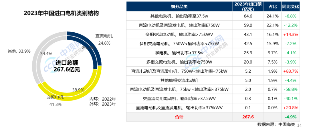 2023年,中国电机进口总额约267.6亿元 ,同比下降约5%。从电机细分品类看,交流电机进口比例有所增加,全年进口占比约41.3%,同比增长2.4%。