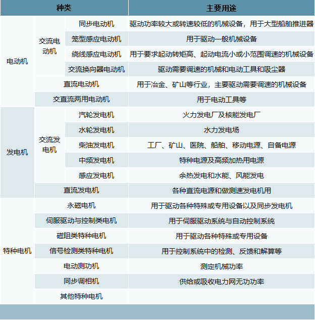 电机产品分类和主要用途