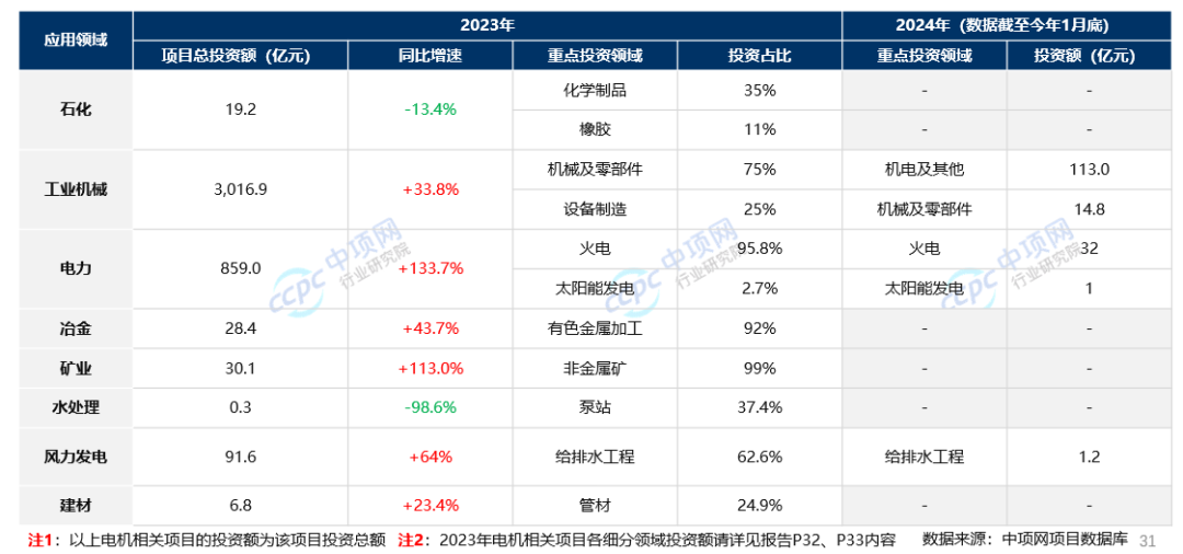 据中项网招投标数据显示,2023年,中国电机市场相关招投标项目中,工业机械领域投资规模最大,投资总额超3千亿元,电力、矿业、风电领域投资增幅度较大,分别增长了133.7%、113.0%、64%,石化、水处理投资规模下滑,其中水处理投资规模下滑近1倍。