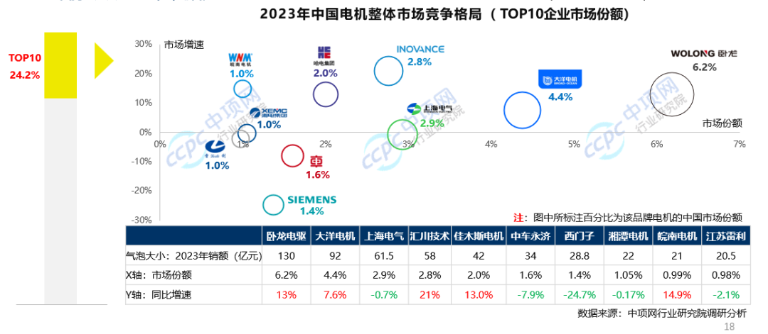 (2)国内电机整体市场集中度偏低,TOP10企业市场份额不足四分之一。