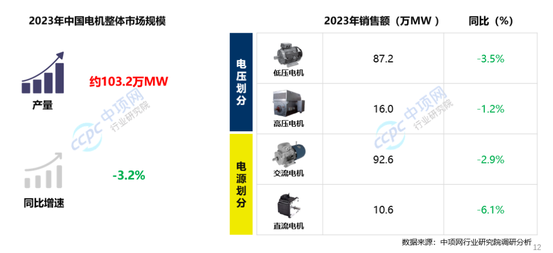 2023年,中国电机产量整体处于下滑态势,全年电机总产量约103.2万MW,同比下降3.2%。