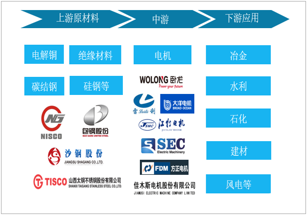 电机行业产业链上游主要是电解铜、硅钢、碳结钢、绝缘材料等原材料供应商;下游行业主要有冶金、水利、石化、建材、风电、造纸、市政、造船等,具体如下: