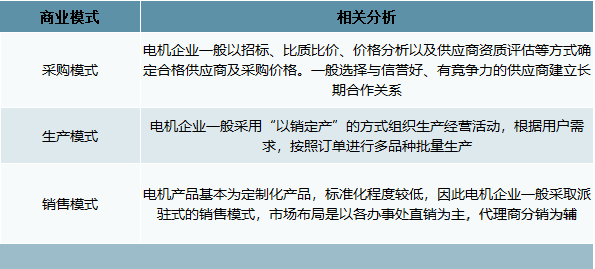 从采购模式看,电机企业一般以招标、比质比价、价格分析以及供应商资质评估等方式确定合格供应商及采购价格。一般选择与信誉好、有竞争力的供应商建立长期合作关系;从生产模式看,电机企业一般采用“以销定产”的方式组织生产经营活动,根据用户需求,按照订单进行多品种批量生产;从销售模式看,电机产品基本为定制化产品,标准化程度较低,因此电机企业一般采取派驻式的销售模式,市场布局是以各办事处直销为主,代理商分销为辅。