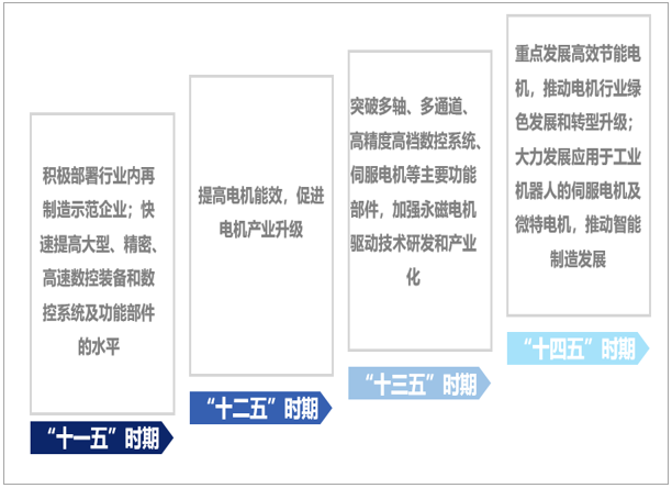 从相关政策历程来看,我国电机行业发展从开始部署大型、精密、高速数控装备及系统发展至推动电机绿色发展及提高智能制造水平。“十一五”规划时期,积极部署行业内再制造示范企业,快速提高数控装备和数控系统及功能部件的水平;“十二五“规划时期,国家持续发展电机,提高电机能效,促进电机产业升级;“十三五”规划时期,国家在要求突破具体的电机产品,包括伺服电机及永磁电机等;“十四五”期间,重点发展高效节能电机,推动电机行业绿色发展和转型升级,大力发展应用于工业机器人的伺服电机及微特电机,推动智能制造发展。